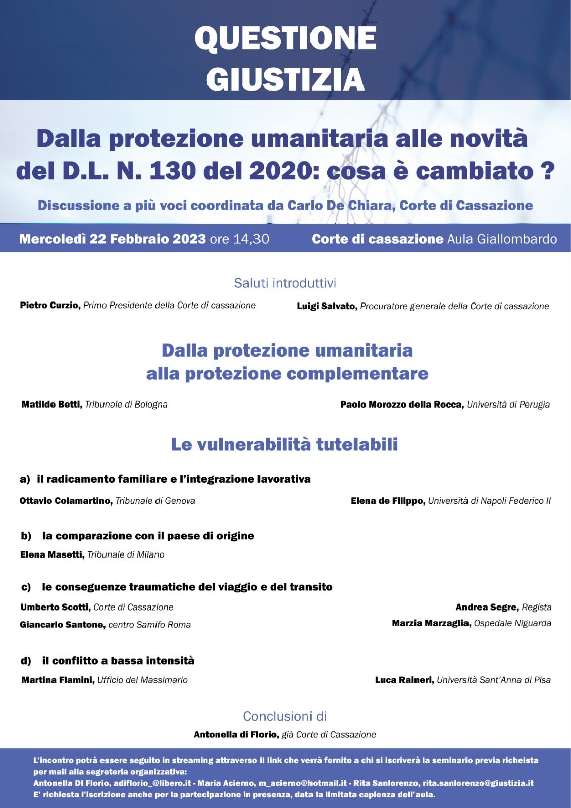 [Area] "Dalla protezione umanitaria alla protezione complementare: cosa è cambiato?" : Corte di Cassazione, Aula Giallombardo, mercoledì 22 febbraio 2023 ore 14,30