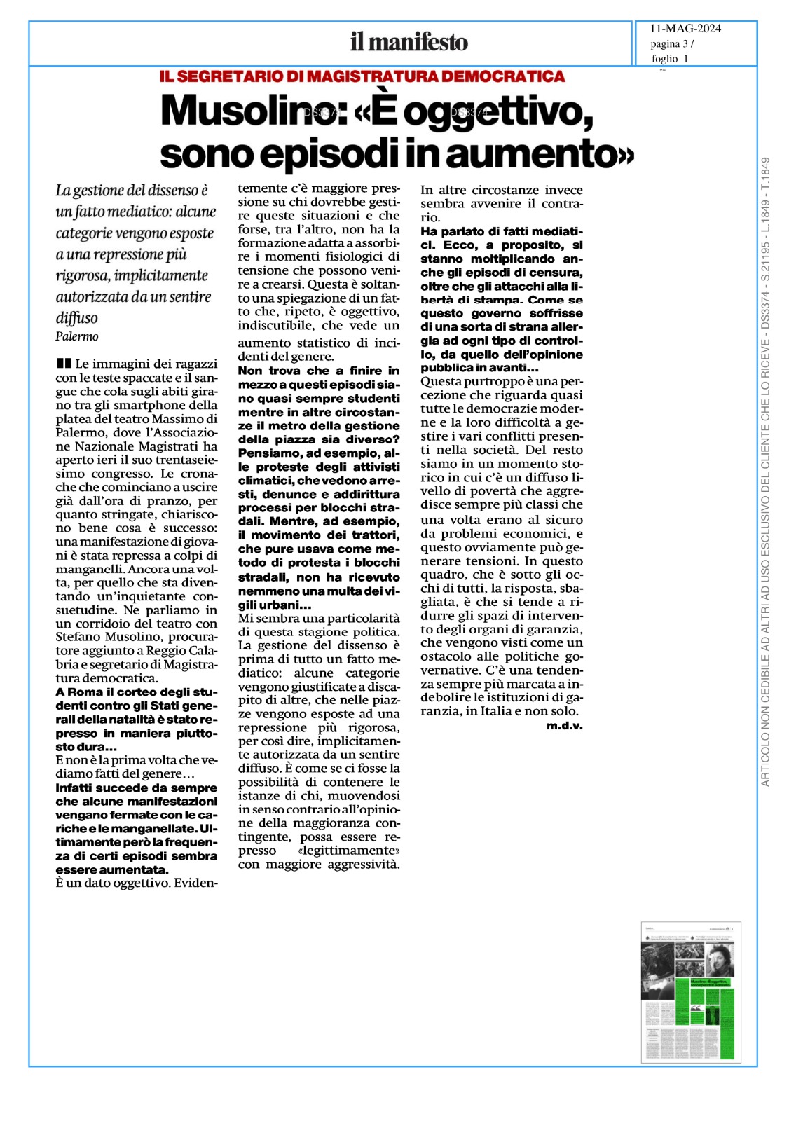 [Area] Musolino: "È oggettivo, sono episodi in aumento" - il Manifesto, 11 maggio 2024