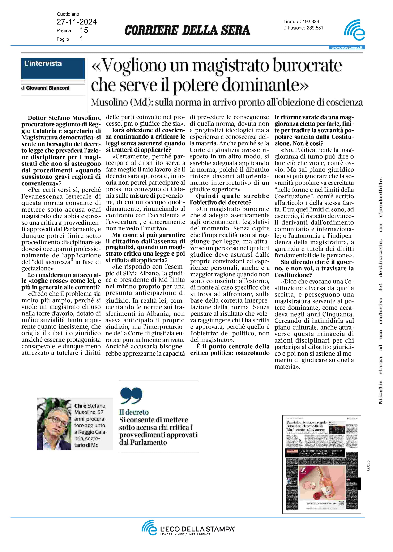 [Area] Musolino: "Vogliono un magistrato burocrate che serve il potere dominante" - Il Corriere, 27 novembre 2024