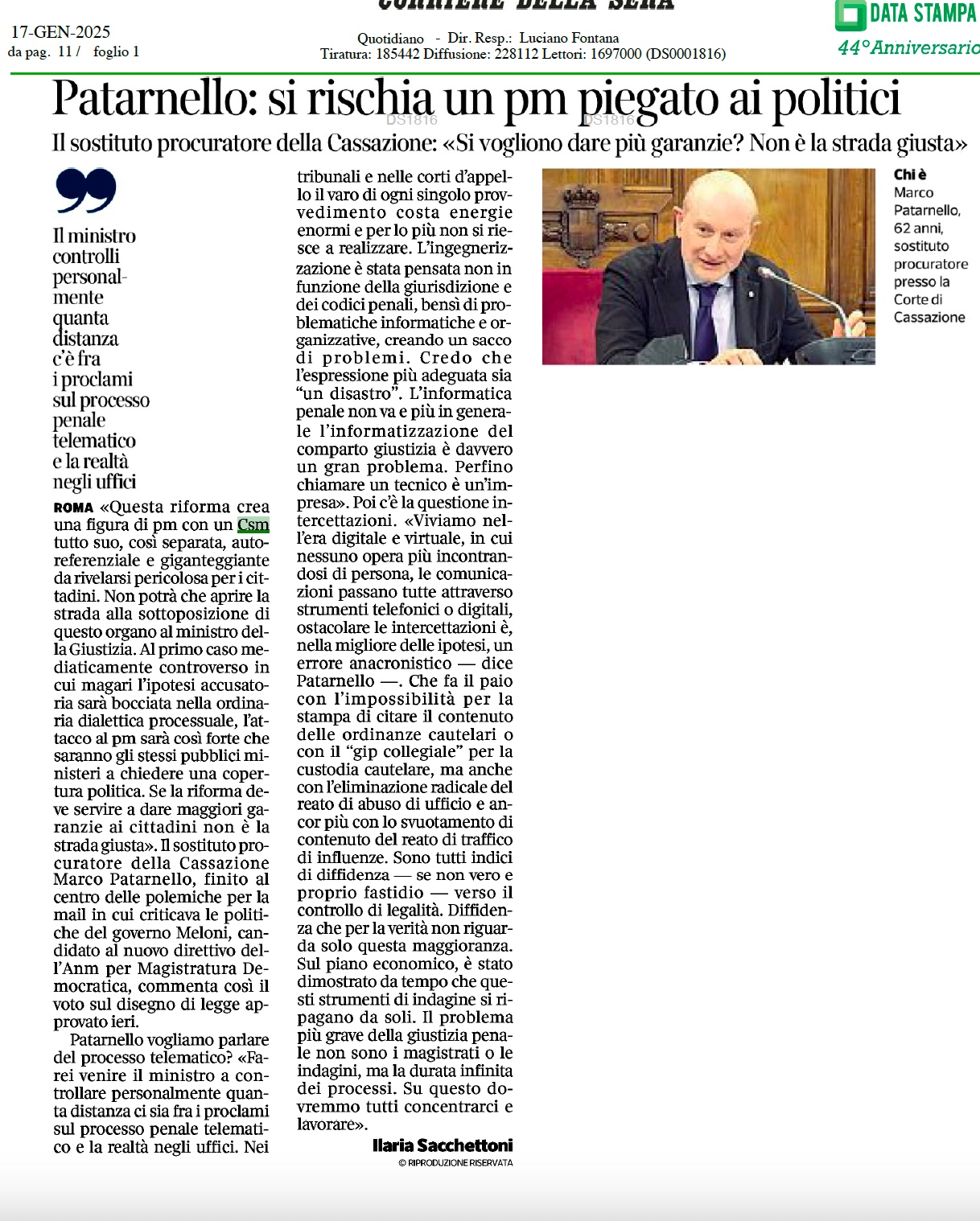 [Area] Patarnello: "si rischia un pm piegato ai politici" - Corriere della Sera, 17 gennaio 2025