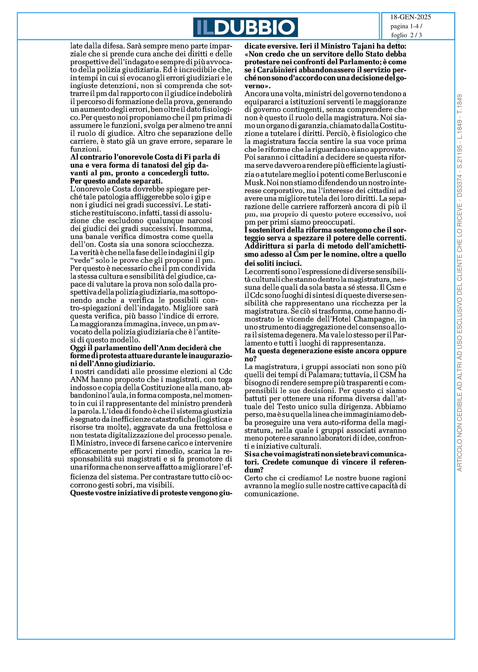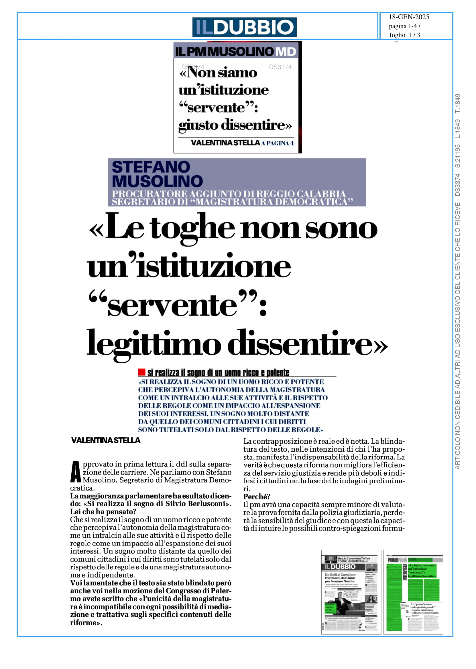 [Area] Musolino: "Le toghe non sono un'istituzione "servente": legittimo dissentire" - il Dubbio, 18 gennaio 2025