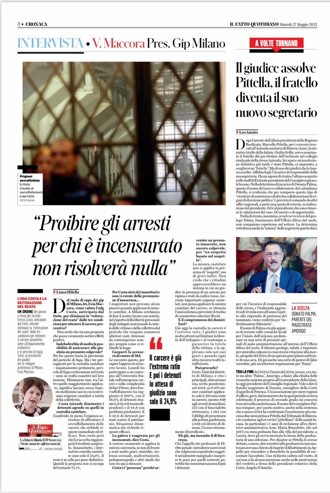 [Area] Maccora: "Proibire gli arresti per chi č incensurato non risolverā nulla" - il Fatto Quotidiano, 27 maggio 2025