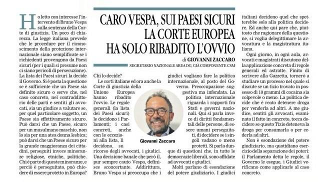[Area] AreaDG, Zaccaro: "Caro Vespa, sui paesi sicuri la Corte Europea ha solo ribadito l'ovvio"